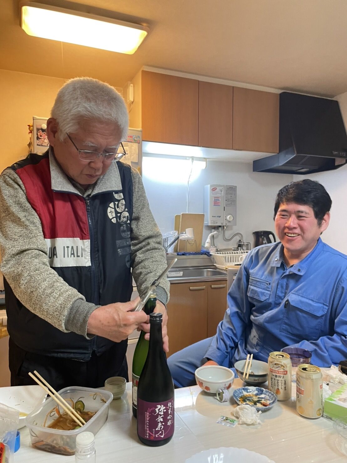 大和さんが推譲生搾りをお父さんに注いでる貴重なシーン